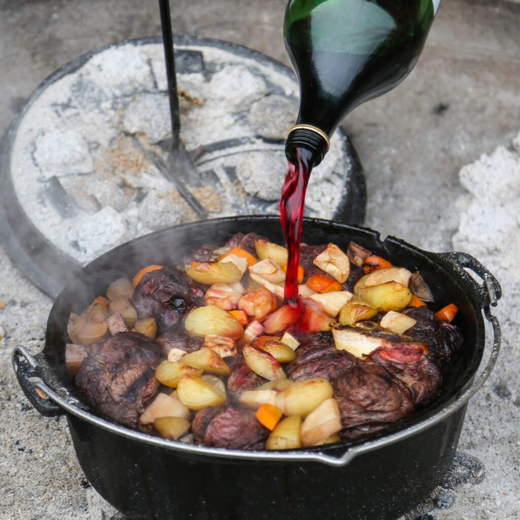 4 Beinscheiben vom Wagyu, 300ml Rotwein (trocken), 500ml passierte Tomaten, 700ml Wagyu Vital (Rinderbrühe), 3 Selleriestangen oder ½ Sellerieknolle, 4 Möhren, 1 Stange Poree, 3 Zwiebeln (weiß), 4 Knoblauchzehen (gehackt), 1 EL Tomatenmark, Salz, Pfeffer